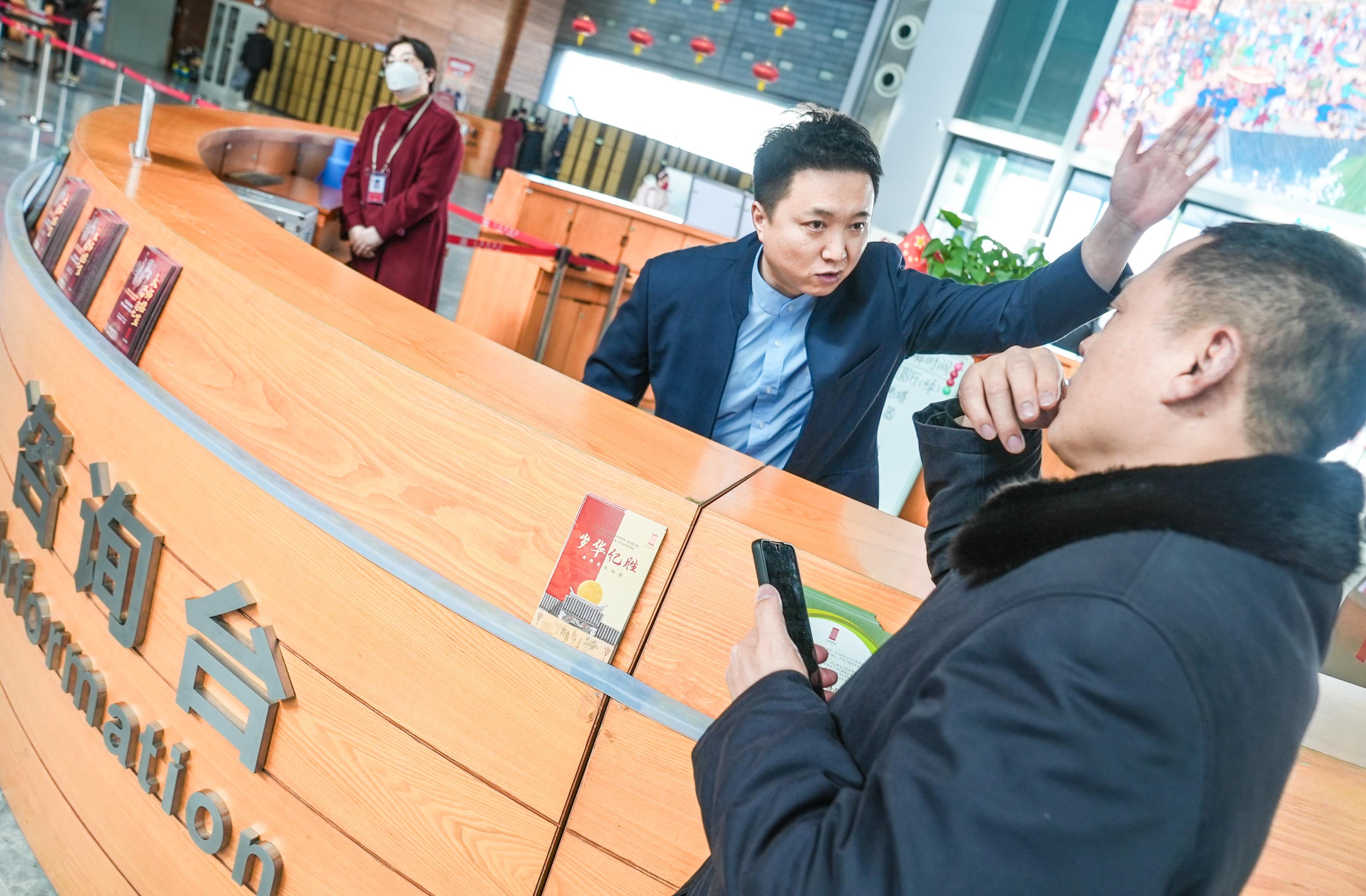 5分钟后,首博开馆迎客,中心区咨询台迎来一波服务高峰——“特展怎么买票?”“圆厅和方厅都有什么展览?从哪个展览开始逛人最少?”面对如潮的问题,王达配合咨询台同事,对答如流。暖心服务也在细节中体现。看到腿脚不便的观众入馆,他会主动推来轮椅,安排工作人员护送。寒假亲子观众多,王达也总是贴心地嘱咐一句,“假期人多,提醒孩子不要追跑打闹。我们还组织了手工制作的体验活动,家长可以关注下时间。”