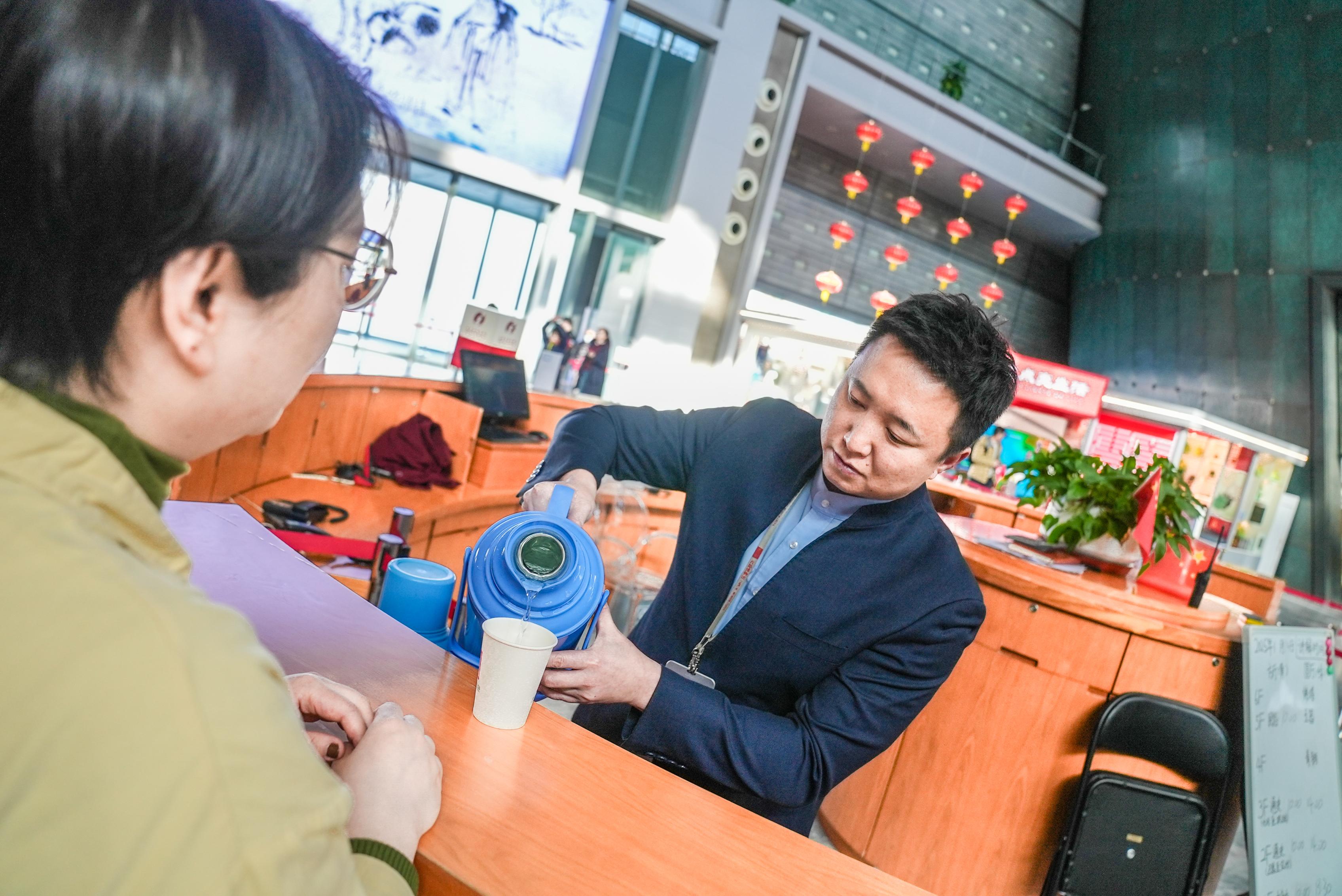 咨询台准备了热水,王达在为有需要的参观者倒水。