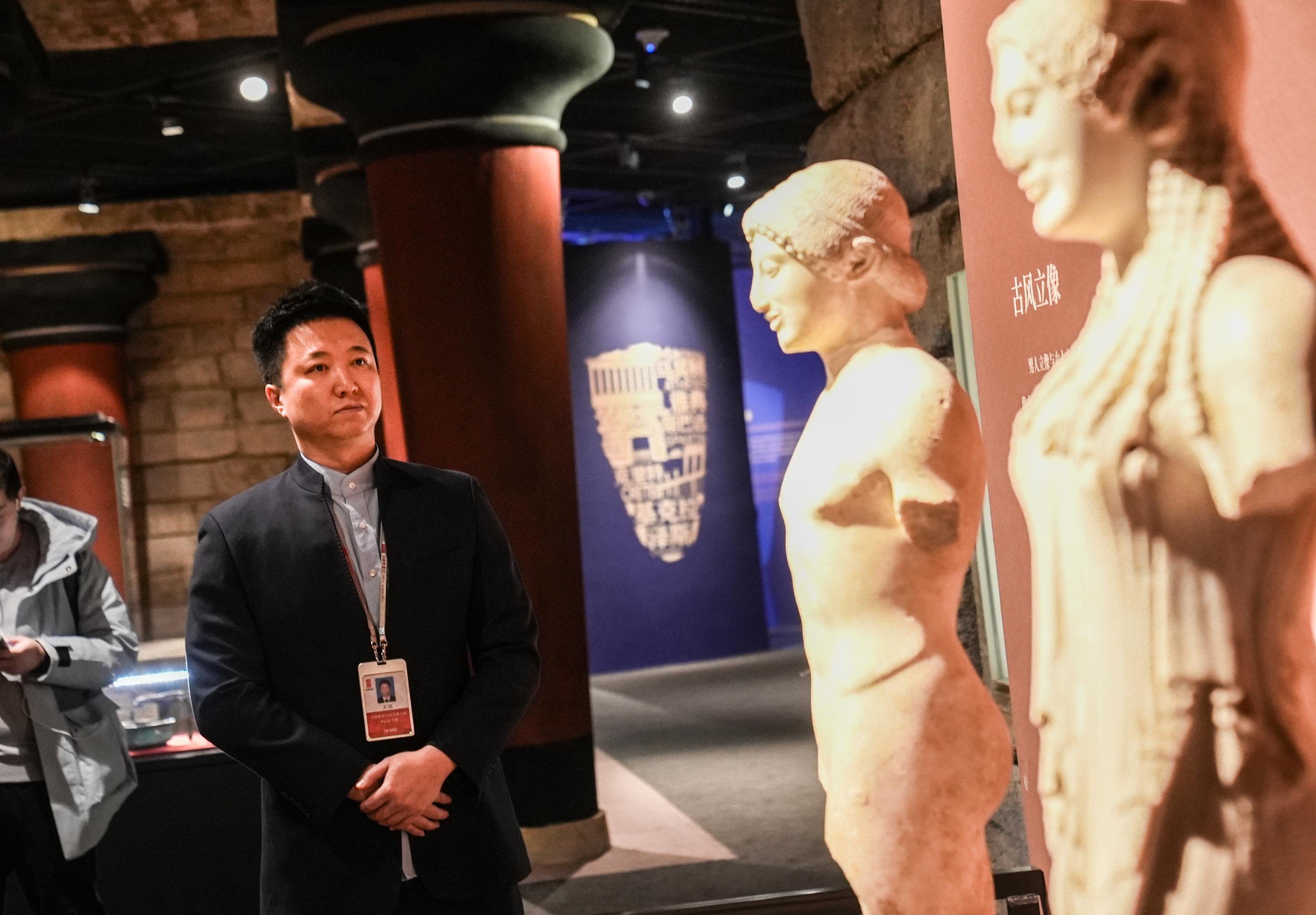 8时55分,首博中心区工作准备就绪。馆外,等待参观的游客排起了队,不少人是奔着“希腊人”特展而来,希望一睹古希腊社会文明风貌。王达又从咨询台捧来一摞展览宣传册发放给观众,向他们详细预告各展览的讲解时间。